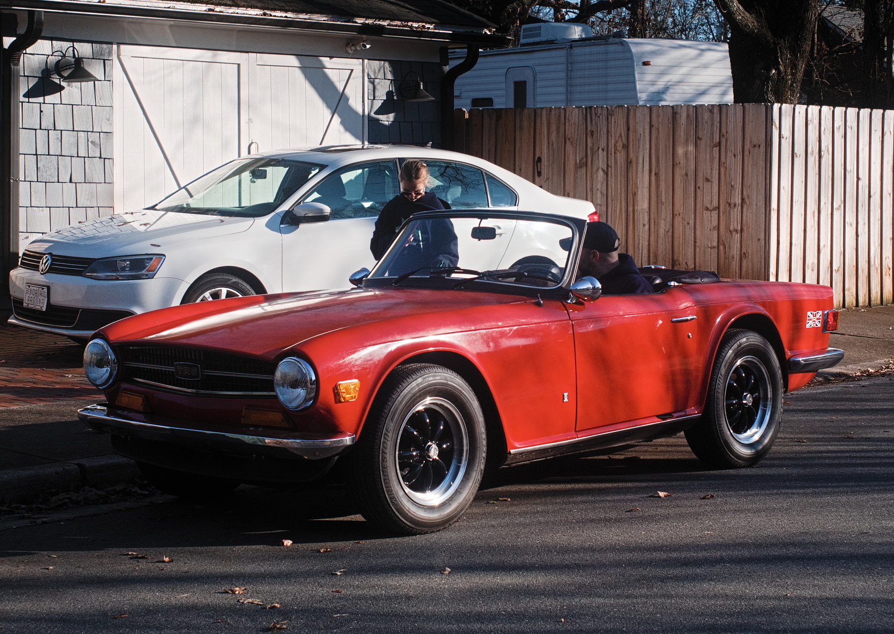 It's a December afternoon, but warm enough to motor about with the top down, and early enough to be home before the Prince of Darkness causes the headlights to fail. The paint looks sufficiently sorry to be original, but everything else looks great. The driver tells me the car belongs to his neighbor, who doesn't have time to take it out. Wait, why don't I have a neighbor like that? It's a Triumph TR6, for any of you benighted souls who can't remember the waning years of the classic British sports car. Super Tak 35/3.5.