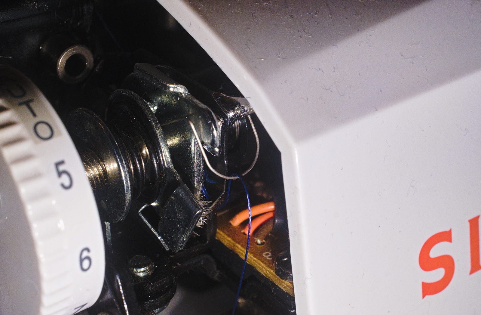 An internet search turned up very little. A few people reported the same problem as mine, "runs a few stitches, beeps and quits". The consistency of the problem made it sound like it might be something in the electronic control system. I was inclined to believe it was a board, which I certainly couldn't fix. A couple of times I almost gave up and decided to give it to the mechanic at Triad Sew & Vac to part out or fix and donate. But after a few days I took a final look and noticed that what serves for a take-up spring looked bent or out of place. Close inspection showed that it had come unhooked on one end, and once I got it hooked back in place, the machine started sewing.