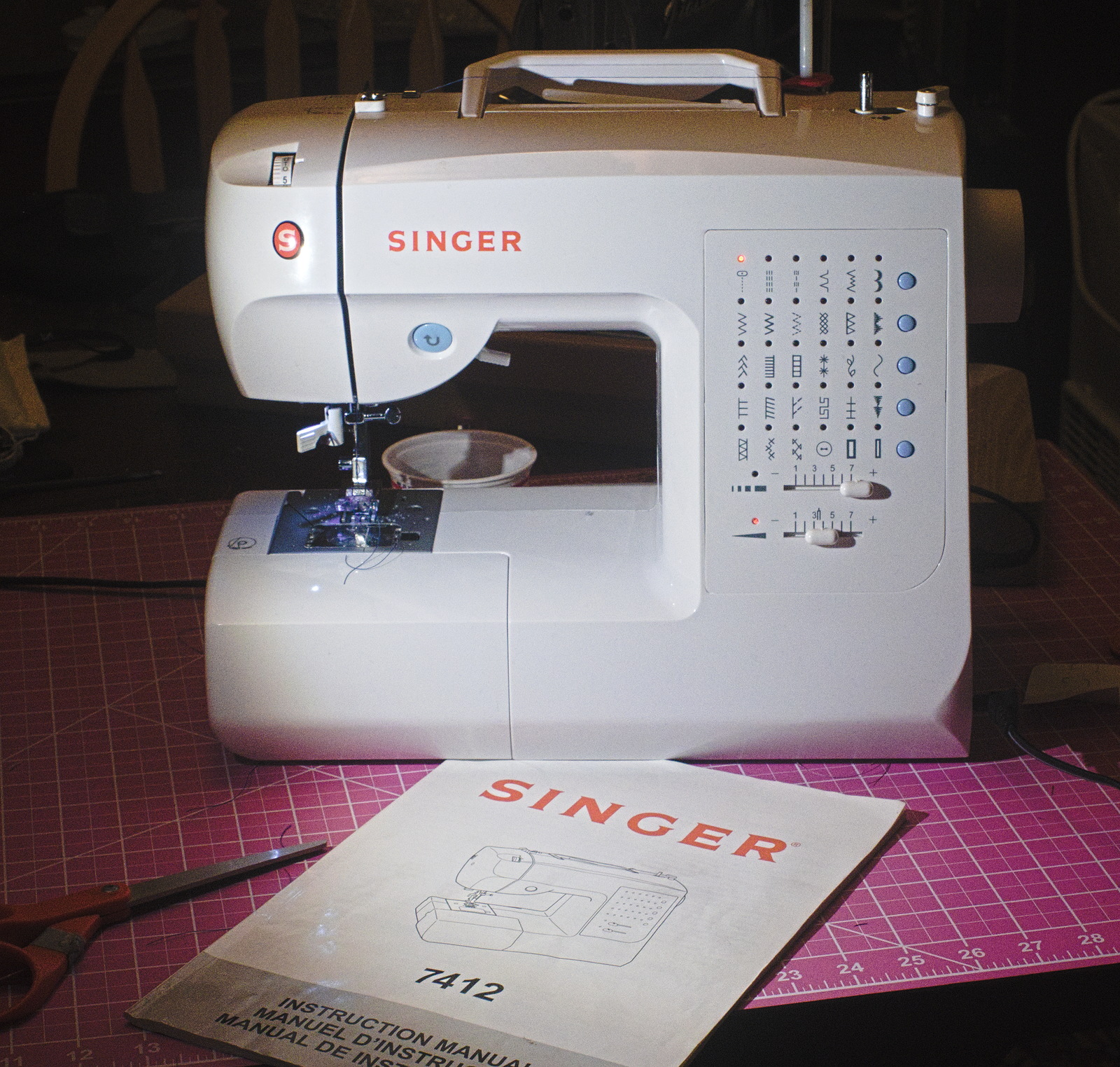 What little I have been able to find indicates the 7412 model was built in 2005. There were a few more in the 74 sequence, and they were superseded by the Curvy models. In other words, an unremarkable series of machines from the low point of the Singer Sewing Machine Company. Around 2013 Singer introduced their Heavy Duty line which has done a bit to resurrect their reputation.