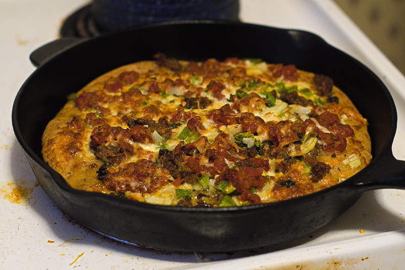 I'm not going to claim this is a Chicago-style pizza, but it has some of the characteristics of one. Baked in a cast-iron skillet, it has a thick crust coated in olive oil, a layer of cheese, toppings, and then a very thick, highly-spiced sauce spooned judiciously over the top.