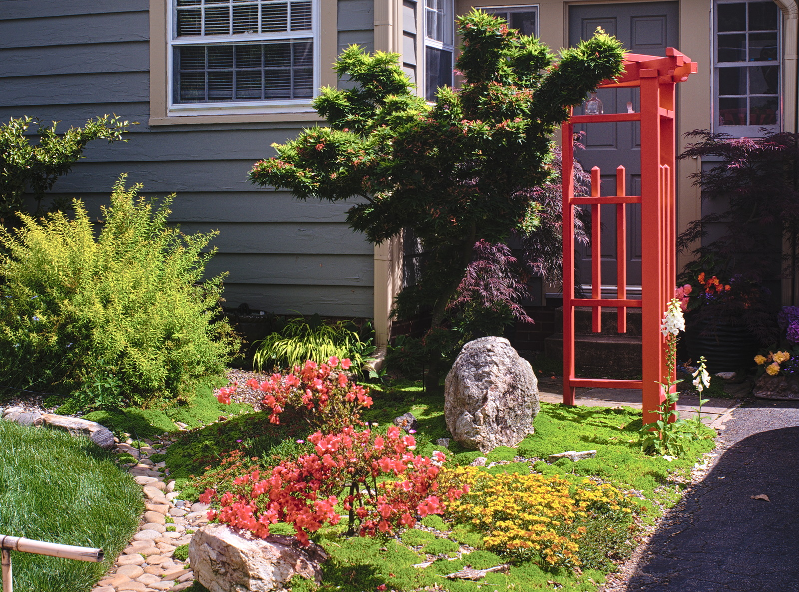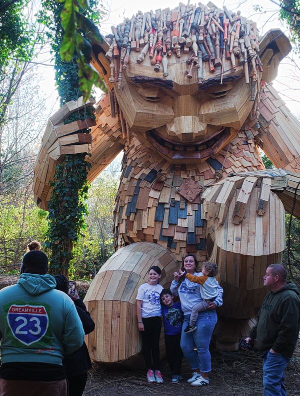 Danish artist Thomas Dambo makes giant sculptures that he calls trolls out of recycled materials. So far he and his crew, often with help from local artisans, have built over 170 of them in 20 countries as part of his "Trail of a Thousand Trolls" project. North Carolina has been favored with at least seven, five in the Raleigh area, one in Charlotte, and a brand new one in High Point. When Lars and I visited it earlier today, we found it swarmed with people, but evidently nothing like the first few days when there were lines of up to an hour to see it. The sculpture is in a small area hacked out of the brush surrounding an abandoned factory site. Parking is in a small dirt lot on Grimes Street nearby. There is no signage on the street, but it is easy to find by the constant stream of excited children and adults disappearing down a narrow path into the brush.