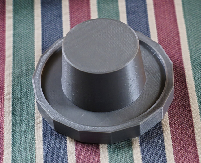 Mast Step Cap. Mark has a fleet of dinghies and Hobie Cats. One of them has a hole in the foredeck that the mast steps into. Simple physics determine that water and trash collect in the hole any time the mast is not stepped. One morning Mark idly emailed me with a sketch of a plug to cover the hole, along with some estimated dimensions, asking if it looked like the kind of thing that could be printed. Using OpenSCAD, I quickly drew something up, printed it and sent him a photo of the completed part that afternoon. Object lesson in rapid prototyping.