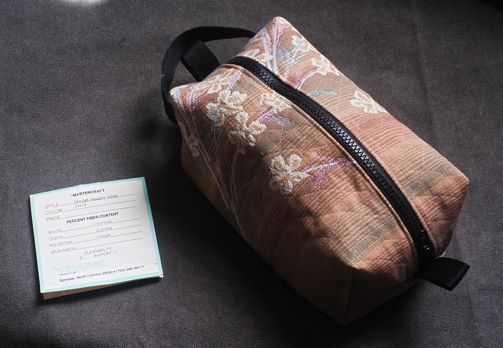 On a recent visit to Reconsidered Goods I found a barrel of what appeared to be upholstery samples and the invitation to stuff a bag full and pay $1.00. I found several nice pieces, including an attractive jacquard more than large enough to make a kit bag. It had what appears to be an original tag showing that it was a product of Mastercraft, a brand of Collins & Aikman's Decorative Fabrics Division.