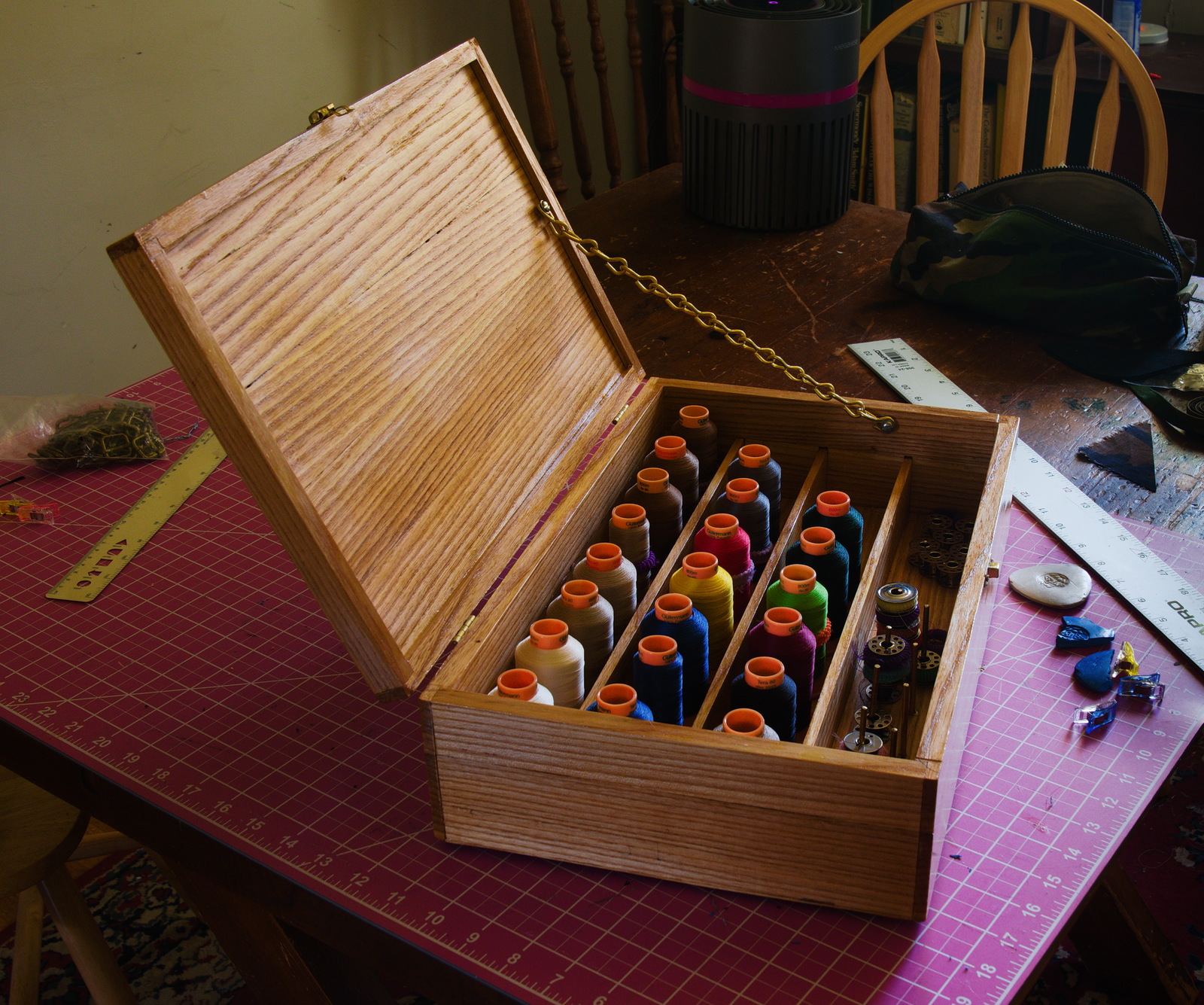 I started today adding a lid chain that just came in the mail from Brettun's Village, an amazing store in Maine that sells box and trunk hardware. Next I stocked it with my cones and bobbins of Gutermann Tera 80 thread. It's much easier to find a color with it organized in a box rather than jumbled together in a kit bag. With that done, I spent an hour composing a photograph and then processing it just the way I wanted in Raw Therapee. It's all a good morning's work, no time for boredom.