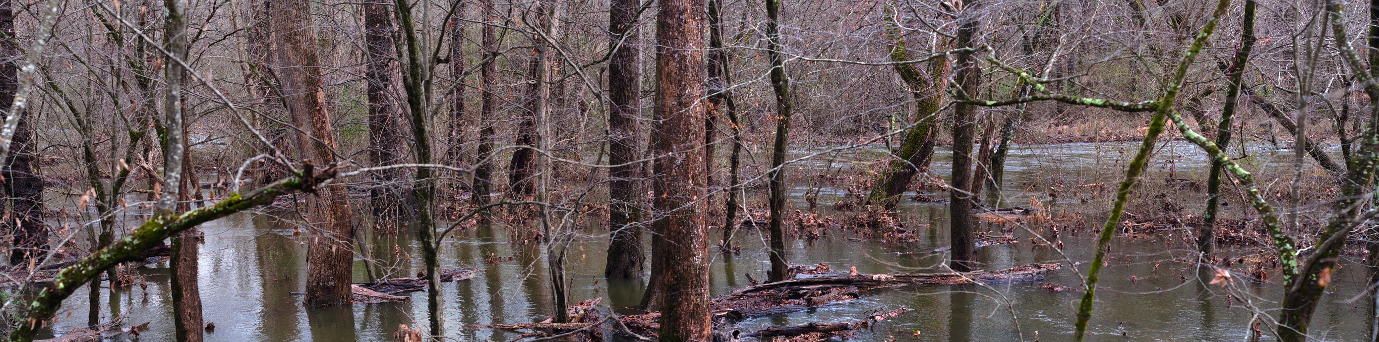 Flooding on the Deep River in High Point earlier today, February 13th, 2025. Image is four frame panoramic stitched in Hugin. Click on the image to see in it's own tab, then click it from there to see full size.